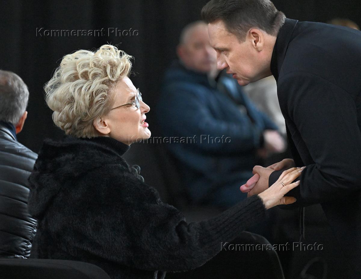 Церемония прощания с телеведущим Юрием Николаевым на Троекуровском кладбище. Первый заместитель председателя комитета Государственной думы России по экологии, природным ресурсам и охране окружающей среды Вячеслав Фетисов (справа) и его супруга Лада Фетисова (в центре) на церемонии.
