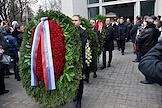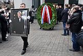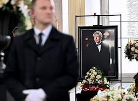 Церемония прощания с телеведущим Юрием Николаевым на Троекуровском кладбище. Телеведущий Валдис Пельш (в центре) на церемонии.
