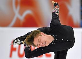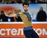 Гран-при России по фигурному катанию 2025/2026. 3-й этап "Идель" во Дворце спорта. Мужчины. Короткая программа. Фигурист Владислав Дикиджи во время выступления.