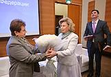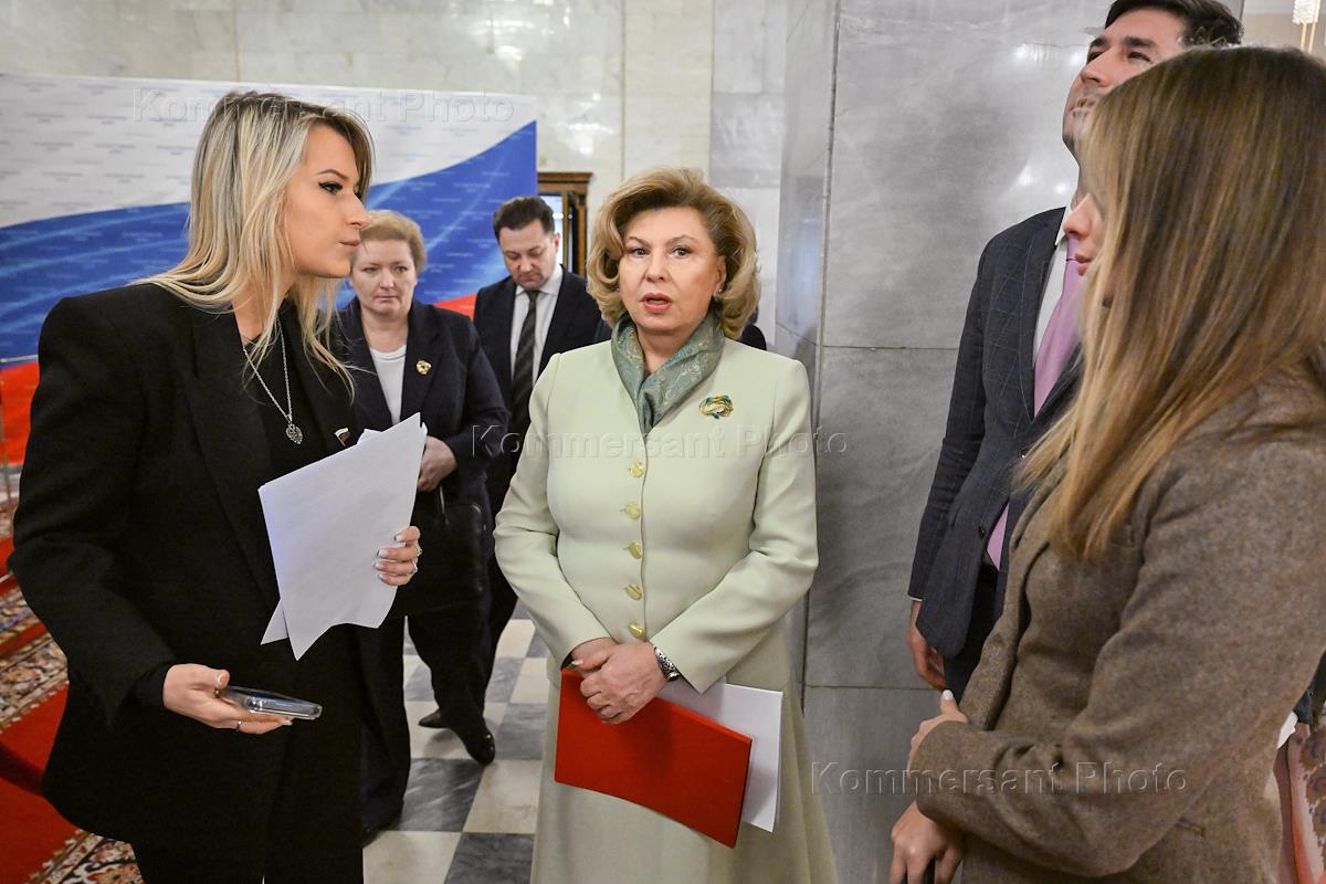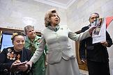 Парламентские слушания на тему "Совершенствование правового регулирования института уполномоченных по правам человека в Российской Федерации: новые вызовы, новые решения", организованные комитетом Государственной думы (ГД) России по развитию гражданского общества, вопросам общественных и религиозных объединений в ГД России. Уполномоченный по правам человека в России Татьяна Москалькова (в центре) перед началом слушаний.