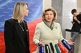Парламентские слушания на тему "Совершенствование правового регулирования института уполномоченных по правам человека в Российской Федерации: новые вызовы, новые решения", организованные комитетом Государственной думы (ГД) России по развитию гражданского общества, вопросам общественных и религиозных объединений в ГД России. Аудитор Счетной палаты России Светлана Орлова (слева) и уполномоченный по правам человека в России Татьяна Москалькова (в центре) после слушаний.