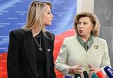 Парламентские слушания на тему "Совершенствование правового регулирования института уполномоченных по правам человека в Российской Федерации: новые вызовы, новые решения", организованные комитетом Государственной думы (ГД) России по развитию гражданского общества, вопросам общественных и религиозных объединений в ГД России. Председатель комитета ГД России по развитию гражданского общества, вопросам общественных и религиозных объединений Яна Лантратова (слева) и уполномоченный по правам человека в России Татьяна Москалькова (в центре) перед началом слушаний.