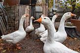 Жанровая фотография. Гуси во дворе частного жилого дома.