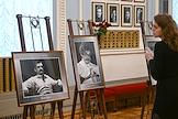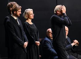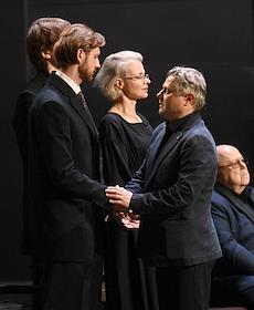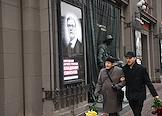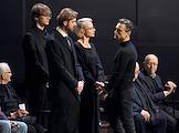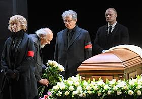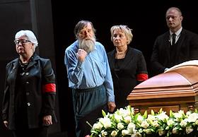 Церемония прощания с артистом Владимиром Симоновым в театре имени Евгения Вахтангова. Слева направо: сын Владимира Симонова, актер Василий Симонов, вдова Владимира Симонова, актриса Яна Соболевская и актер Александр Яцко на церемонии.