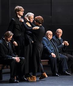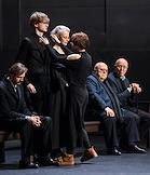 Церемония прощания с артистом Владимиром Симоновым в театре имени Евгения Вахтангова. Слева направо: сыновья Владимира Симонова, актеры Владимир и Василий, вдова Владимира Симонова, актриса Яна Соболевская и актер Виктор Добронравов на церемонии.