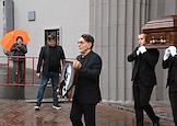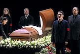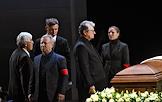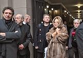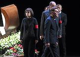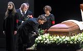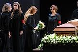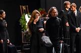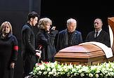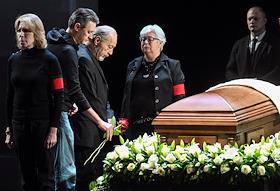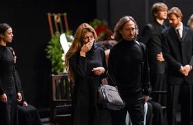 Церемония прощания с артистом Владимиром Симоновым в театре имени Евгения Вахтангова. Вдова Владимира Симонова, актриса Яна Соболевская (в центре), его сыновья Василий (шестой слева), Владимир (пятый слева) и актриса Вера Новикова (третья справа) на церемонии.