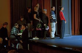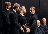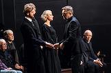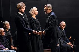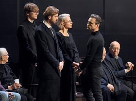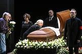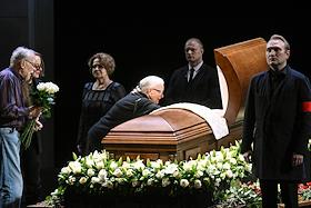 Церемония прощания с артистом Владимиром Симоновым в театре имени Евгения Вахтангова. Актеры Марина Есипенко (в центре) и Михаил Васьков (второй справа) во время церемонии.