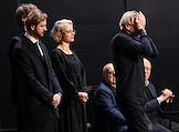 Церемония прощания с артистом Владимиром Симоновым в театре имени Евгения Вахтангова. Вдова Владимира Симонова, актриса Яна Соболевская (третья слева), его сыновья Василий (слева), Владимир (второй слева) и художественный руководитель театра "Et Cetera" Александр Калягин (второй справа) на церемонии.