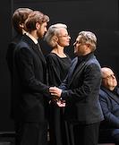 Церемония прощания с артистом Владимиром Симоновым в театре имени Евгения Вахтангова. Ректор Театрального института имени Б.В.Щукина, актер Евгений Князев (слева), продюсер и режиссер Сергей Сенин (второй слева) и актриса Людмила Максакова (в центре) во время церемонии.