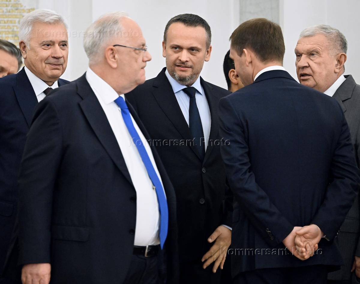 Переговоры президента России Владимира Путина с президентом Казахстана Касым-Жомартом Токаевым. Слева направо: предприниматель Вагит Алекперов, директор Федеральной службы по военно-техническому сотрудничеству (ВТС) Дмитрий Шугаев, министр транспорта России Андрей Никитин, министр природных ресурсов и экологии России Александр Козлов и главный исполнительный директор, председатель правления ПАО "НК "Роснефть" Игорь Сечин перед началом переговоров.
