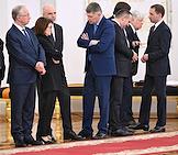 Переговоры президента России Владимира Путина с президентом Казахстана Касым-Жомартом Токаевым в Кремле. Слева направо: заместитель руководителя администрации президента России, пресс-секретарь президента Дмитрий Песков, заместитель руководителя администрации президента России Максим Орешкин, помощник президента России Юрий Ушаков, заместители председателя правительства России Виталий Савельев, Алексей Оверчук и первый заместитель председателя правительства России Денис Мантуров перед началом переговоров.