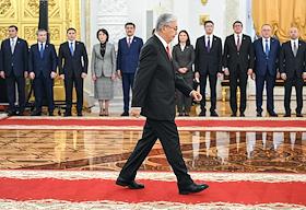 Переговоры президента России Владимира Путина с президентом Казахстана Касым-Жомартом Токаевым в Кремле. Президент Казахстана Касым-Жомарт Токаев (в центре) перед началом переговоров.