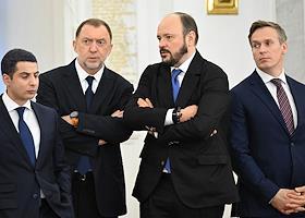 Переговоры президента России Владимира Путина с президентом Казахстана Касым-Жомартом Токаевым в Кремле. Слева направо: основатель компаний РУСАЛ, "Группа ГАЗ" и фонда "Вольное Дело", председатель наблюдательного совета Института экономики роста имени П.А. Столыпина Олег Дерипаска, генеральный директор АО "Башкирская содовая компания" и АО "Березниковский содовый завод" Эдуард Давыдов и председатель правления, генеральный директор ПАО "ФосАгро" Андрей Гурьев перед началом переговоров.