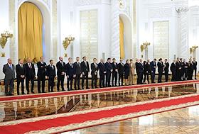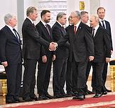 Переговоры президента России Владимира Путина с президентом Казахстана Касым-Жомартом Токаевым в Кремле. Слева направо: генеральный директор, председатель правления АО "Почта России" Михаил Волков, генеральный директор - председатель правления ОАО "РЖД" Олег Белозеров, генеральный директор госкорпорации "Роскосмос" Дмитрий Баканов, предприниматель Вагит Алекперов (четвертый справа), первый заместитель министра промышленности и торговли России Василий Осьмаков (третий справа) и первый заместитель министра энергетики России Павел Сорокин (второй справа) перед началом переговоров.