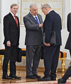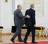Переговоры президента России Владимира Путина с президентом Казахстана Касым-Жомартом Токаевым в Кремле. Заместитель министра иностранных дел России Михаил Галузин (слева) и посол России в Казахстане Алексей Бородавкин (в центре) перед началом переговоров.