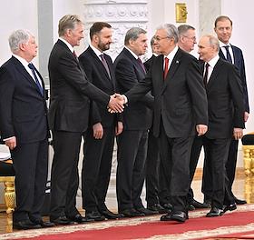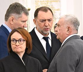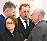 Переговоры президента России Владимира Путина с президентом Казахстана Касым-Жомартом Токаевым. Слева направо: первый заместитель министра промышленности и торговли России Василий Осьмаков, министр экономического развития России Максим Решетников, председатель Центрального Банка России Эльвира Набиуллина, основатель компаний РУСАЛ, "Группа ГАЗ" и фонда "Вольное Дело", председатель наблюдательного совета Института экономики роста имени П.А. Столыпина Олег Дерипаска и главный исполнительный директор, председатель правления ПАО "НК "Роснефть" Игорь Сечин перед началом переговоров.