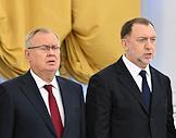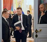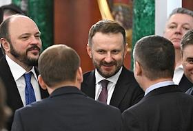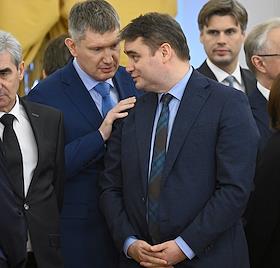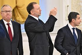Переговоры президента России Владимира Путина с президентом Казахстана Касым-Жомартом Токаевым в Кремле. Председатель правления, генеральный директор ПАО "ФосАгро" Андрей Гурьев (слева) и заместитель руководителя администрации президента России Максим Орешкин (в центре) перед началом переговоров.