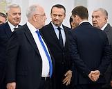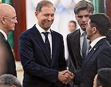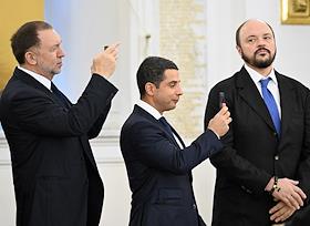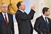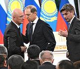 Переговоры президента России Владимира Путина с президентом Казахстана Касым-Жомартом Токаевым в Кремле. Слева направо: первый заместитель премьер-министра Республики Казахстан Роман Скляр, первый заместитель председателя правительства России Денис Мантуров и генеральный директор госкорпорации "Роскосмос" Дмитрий Баканов перед началом переговоров.