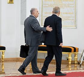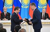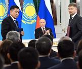 Переговоры президента России Владимира Путина с президентом Казахстана Касым-Жомартом Токаевым в Кремле. Церемония подписания документов по итогам российско-казахстанских переговоров. Президент России Владимир Путин (в центре) и генеральный директор - председатель правления ОАО "РЖД" Олег Белозеров (справа) во время церемонии.