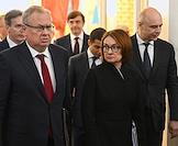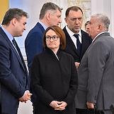 Переговоры президента России Владимира Путина с президентом Казахстана Касым-Жомартом Токаевым в Кремле. Слева направо: председатель Центрального Банка России Эльвира Набиуллина, предприниматель Вагит Алекперов и главный исполнительный директор, председатель правления ПАО "НК "Роснефть" Игорь Сечин перед началом переговоров.