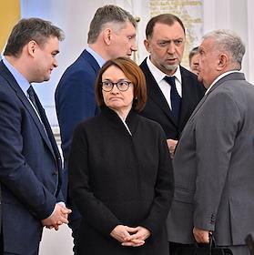 Переговоры президента России Владимира Путина с президентом Казахстана Касым-Жомартом Токаевым. Слева направо: министр экономического развития России Максим Решетников, председатель Центрального Банка России Эльвира Набиуллина, основатель компаний РУСАЛ, "Группа ГАЗ" и фонда "Вольное Дело", председатель наблюдательного совета Института экономики роста имени П.А. Столыпина Олег Дерипаска и главный исполнительный директор, председатель правления ПАО "НК "Роснефть" Игорь Сечин перед началом переговоров.