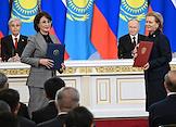 Переговоры президента России Владимира Путина с президентом Казахстана Касым-Жомартом Токаевым в Кремле. Церемония подписания документов по итогам российско-казахстанских переговоров. Президент Казахстана Касым-Жомарт Токаев (слева), президент России Владимир Путин (второй справа) и руководитель Федеральной службы по надзору в сфере защиты прав потребителей и благополучия человека - главный государственный санитарный врач России Анна Попова (справа) во время церемонии.
