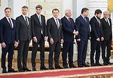 Переговоры президента России Владимира Путина с президентом Казахстана Касым-Жомартом Токаевым в Кремле. Слева направо: заместитель министра иностранных дел России Михаил Галузин, председатель Центрального Банка России Эльвира Набиуллина, министр финансов России Антон Силуанов, министр экономического развития России Максим Решетников, министр транспорта России Андрей Никитин, посол России в Казахстане Алексей Бородавкин и министр природных ресурсов и экологии России Александр Козлов перед началом переговоров.