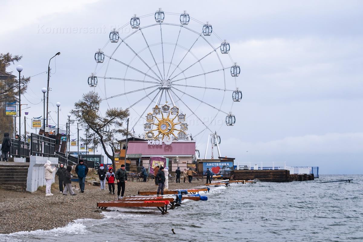 Виды Иркутской области. Причал в поселке Листвянка и колесо обозрения над озером Байкал.