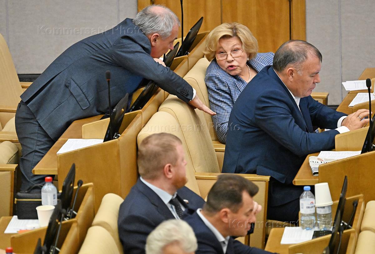 Пленарное заседание Государственной думы (ГД) России. Справа налево: первый заместитель председателя комитета ГД России по государственному строительству и законодательству Ирина Панькина, первый заместитель председателя комитета ГД по культуре Александр Шолохов и первый заместитель председателя комитета ГД России по государственному строительству и законодательству Даниил Бессарабов во время заседания.