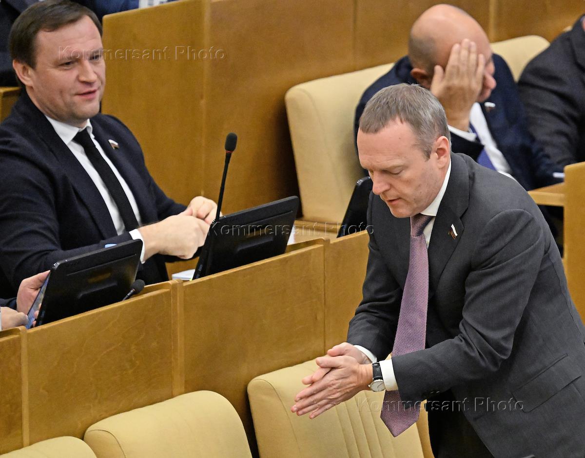 Пленарное заседание Государственной думы (ГД) России. Первый заместитель председателя комитета ГД России по экологии, природным ресурсам и охране окружающей среды Владимир Бурматов (слева) и член комитета ГД России по вопросам собственности, земельным и имущественным отношениям Максим Иванов (справа) во время заседания.