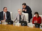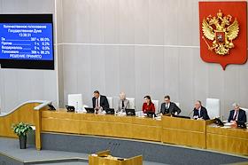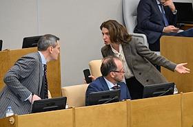 Пленарное заседание Государственной думы (ГД) России. Справа налево: первый заместитель председателя комитета ГД России по государственному строительству и законодательству Ирина Панькина, первый заместитель председателя комитета ГД по культуре Александр Шолохов и первый заместитель председателя комитета ГД России по государственному строительству и законодательству Даниил Бессарабов во время заседания.
