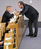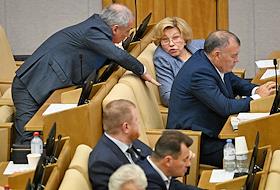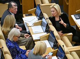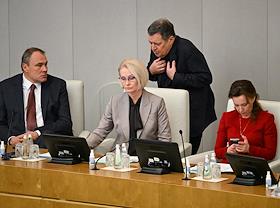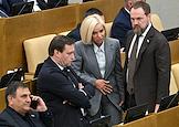Пленарное заседание Государственной думы (ГД) России. Председатель комитета ГД России по развитию гражданского общества, вопросам общественных и религиозных объединений Ольга Тимофеева (справа) и председатель комитета ГД России по экономической политике Максим Топилин (слева) во время заседания.