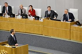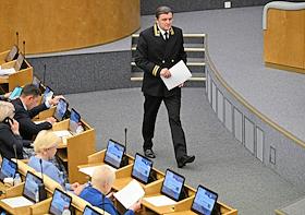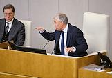 Пленарное заседание Государственной думы (ГД) России. Секретарь Пленума Верховного суда России Олег Зателепин (в центре) и полномочный представитель президента России в ГД России Гарри Минх (справа) на заседании.