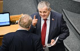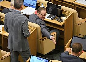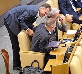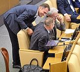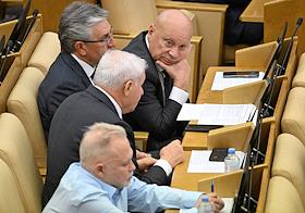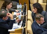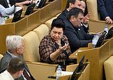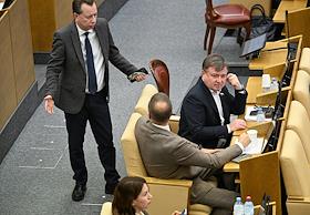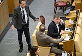 Пленарное заседание Государственной думы (ГД) России. Заместитель председателя комитета ГД России по экологии, природным ресурсам и охране окружающей среды Георгий Арапов (слева) и заместитель председателя комитета ГД России по государственному строительству и законодательству Сардана Авксентьева (в центре) во время заседания.