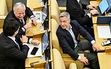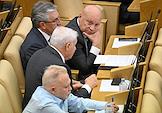 Пленарное заседание Государственной думы (ГД) России. Первый заместитель председателя комитета ГД России по делам Содружества Независимых Государств, евразийской интеграции и связям с соотечественниками Константин Затулин (слева) во время заседания.