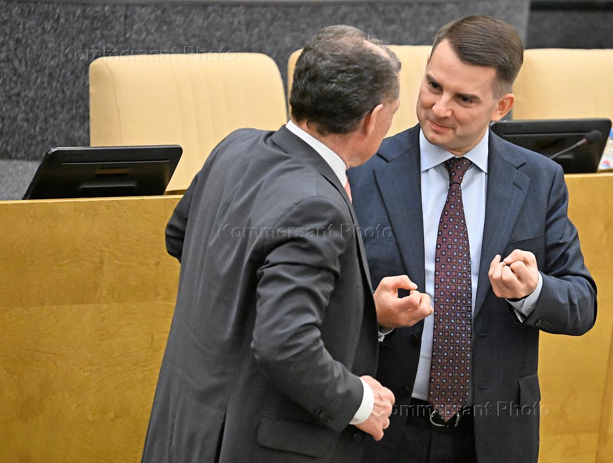 Пленарное заседание Государственной думы (ГД) России. Первый заместитель председателя комитета ГД России по экологии, природным ресурсам и охране окружающей среды Владимир Бурматов (слева) и член комитета ГД России по вопросам собственности, земельным и имущественным отношениям Максим Иванов (справа) во время заседания.