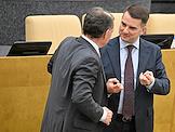 Пленарное заседание Государственной думы (ГД) России. Председатель комитета ГД России по труду, социальной политике и делам ветеранов Ярослав Нилов (справа) и председатель комитета ГД России по экономической политике Максим Топилин (слева) во время заседания.