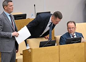 Пленарное заседание Государственной думы (ГД) России. Слева направо: член комитета ГД России по бюджету и налогам Никита Чаплин, член комитета ГД России по бюджету и налогам Вячеслав Фомичев и первый заместитель председателя комитета ГД России по экологии, природным ресурсам и охране окружающей среды Вячеслав Фетисов во время заседания.