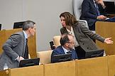 Пленарное заседание Государственной думы (ГД) России. Слева направо: председатель комитета ГД России по физической культуре и спорту Олег Матыцин, член комитета ГД России по строительству и жилищно-коммунальному хозяйству Сергей Колунов и член ГД России по безопасности и противодействию коррупции Динар Гильмутдинов во время заседания.