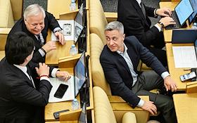Пленарное заседание Государственной думы (ГД) России. Член комитета ГД России по финансовому рынку Олег Димов (слева) и член комитета ГД России по строительству и жилищно-коммунальному хозяйству Марат Нуриев (справа) на заседании.