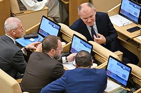 Пленарное заседание Государственной думы (ГД) России. Слева направо: председатель комитета ГД России по физической культуре и спорту Олег Матыцин, член комитета ГД России по строительству и жилищно-коммунальному хозяйству Сергей Колунов, член комитета ГД России по охране здоровья Николай Щеглов и член ГД России по безопасности и противодействию коррупции Динар Гильмутдинов во время заседания.