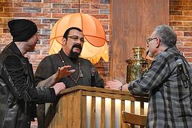 Концерт "Квартирник у Маргулиса. 10 лет." в многофункциональном комплексе "Live Арена". Слева направо: рок-музыкант, музыкальный продюсер, лидер группы "Парк Горького" (Gorky Park) Алексей Белов, американский актер, продюсер, музыкант, мастер айкидо Стивен Сигал и музыкант, телеведущий Евгений Маргулис на концерте.