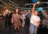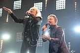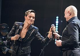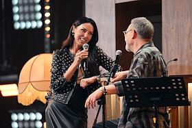 Концерт "Квартирник у Маргулиса. 10 лет." в многофункциональном комплексе "Live Арена". Певец Александр Иванов (слева) и певица Юлия Паршута (справа) на концерте.