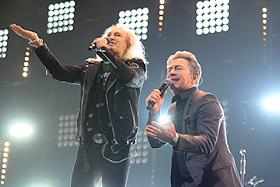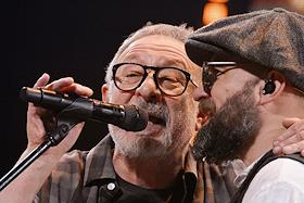 Концерт "Квартирник у Маргулиса. 10 лет." в многофункциональном комплексе "Live Арена". Певцы Александр Иванов (слева) и Валерий Сюткин (справа) во время выступления на концерте.