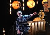 Концерт "Квартирник у Маргулиса. 10 лет." в многофункциональном комплексе "Live Арена". Музыкант, телеведущий Евгений Маргулис (слева) и фронтмен группы The Hatters Юрий Музыченко (справа) во время выступления.