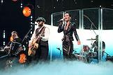Концерт "Квартирник у Маргулиса. 10 лет." в многофункциональном комплексе "Live Арена". Участники группы The Hatters Юрий Музыченко, Павел Личадеев и Анна Музыченко во время выступления на концерте.