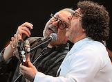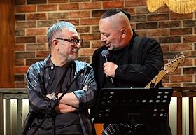 Концерт "Квартирник у Маргулиса. 10 лет." в многофункциональном комплексе "Live Арена". Музыкант, телеведущий Евгений Маргулис (слева) и певец Игорь Саруханов (справа) во время выступления.