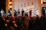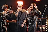 Концерт "Квартирник у Маргулиса. 10 лет." в многофункциональном комплексе "Live Арена". Лидер группы "Рекорд Оркестр" Тимофей Копылов (в центре) и певица Юлия Паршута (справа) во время выступления.