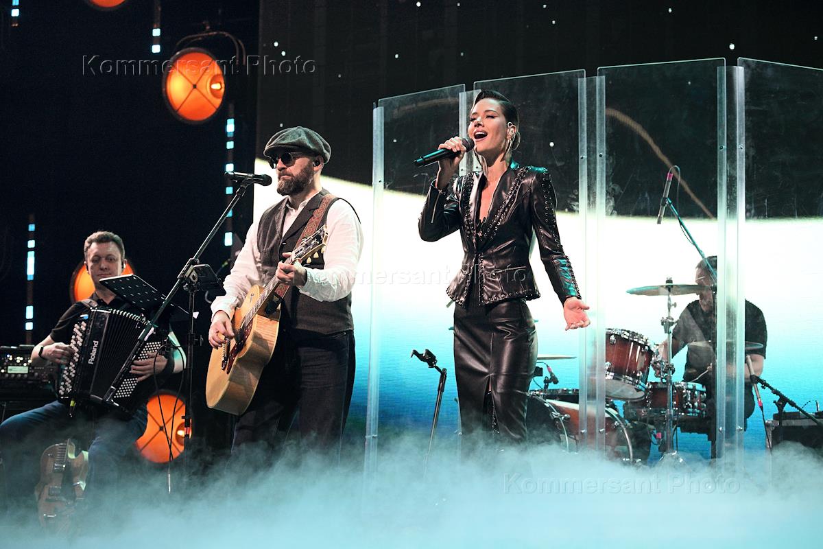 Концерт "Квартирник у Маргулиса. 10 лет." в многофункциональном комплексе "Live Арена". Солист группы Uma2rman Владимир Кристовский (второй справа) и певица Алсу (справа) во время выступления.