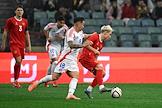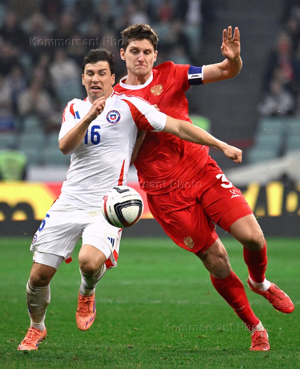 BetBoom - Товарищеский матч по футболу между сборными командами России и Чили на стадионе "Фишт". Игрок сборной России Мингиян Бевеев (справа) и игрок сборной Чили Габриэль Суасо (слева) во время матча.